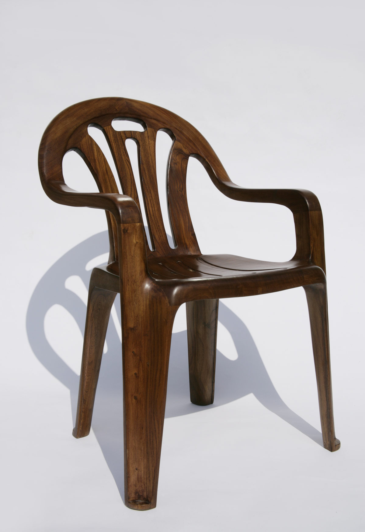 Baas kontrakterade trähantverkare från Shanghai och mixade på så vis ett västerländskt formspråk med ett österländskt tekniskt kunnande; resultatet? Bland annat en av hans möbelskulpturer i oändligt utstuderad österländsk form och ”Plastic Chair in Wood” – en av västerlandets fulaste och populäraste plastmöbler får evigt liv i trä.