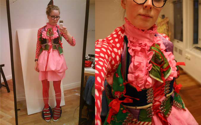På Svensk Form för några år sen ställde en nyexad Konstfackselev ut fantastiskt fina kläder på tema modernt fast med dräktinfluenser. Supersnygga grejer vad jag minns. Och före dagens hajp. Men jag minns inte namnet – trots lite googlande. Kanske återkommer om saken. Hon som gjorde dem är illustratör också.