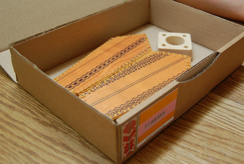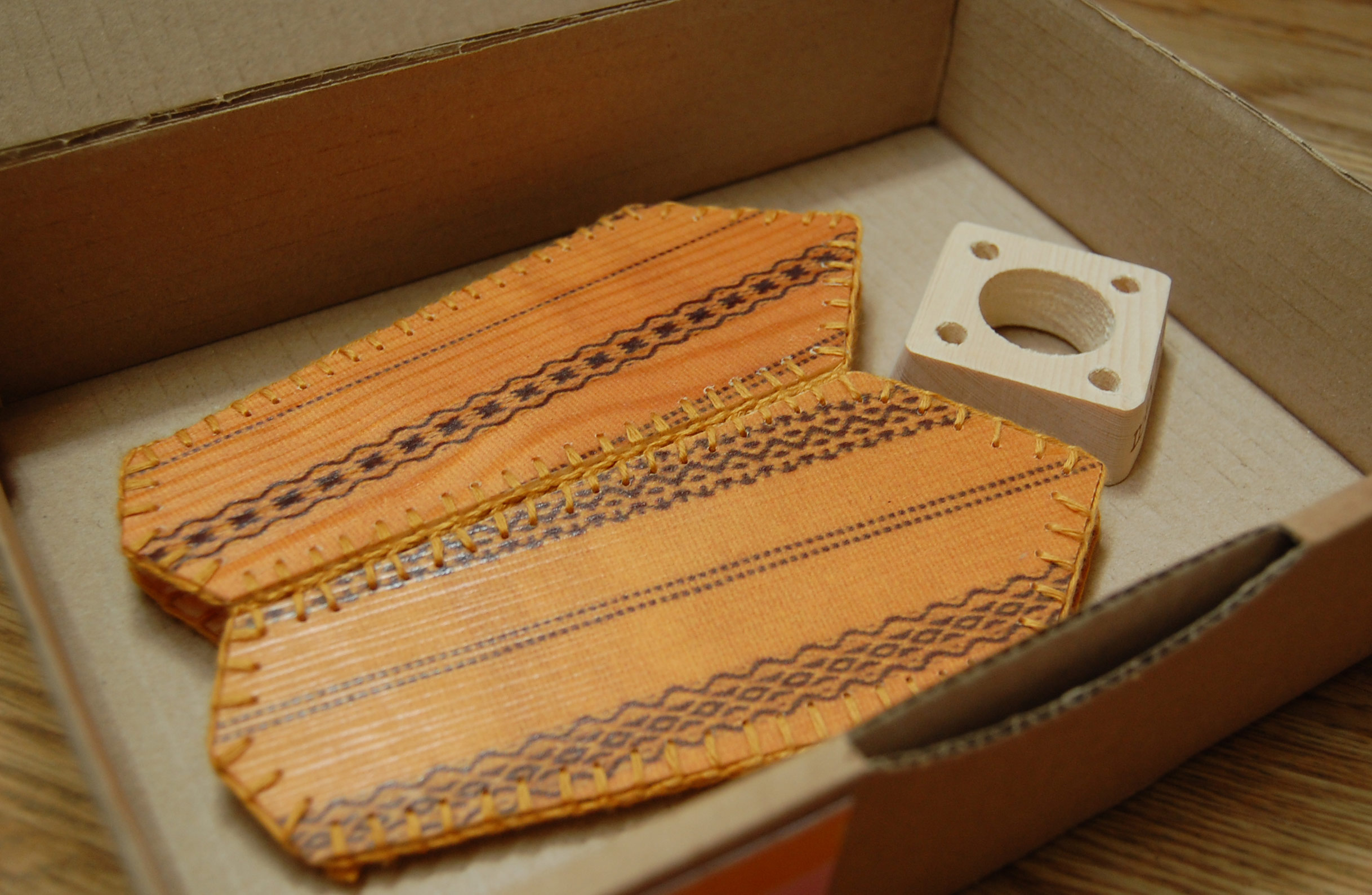 Fia låter trycka dräktmönstret på träet, dess ådringar anas genom mönstret. Och så stansar hon hålen och syr ihop delarna för hand. Samma typ av sömmar håller ihop lamporna som askarna. Med den lilla fiffiga fyrkantiga träbiten hålls lampan utspänd och lyser fint upphängd i ett fönster. Fia kommer att sälja lamporna bland annat på Svensk Hemslöjd i Stockholm och på Leksands hemslöjd. Jag kan också rekommendera ett besök till Fias nya hemsida, där en ny webbshop ska sprida askar och lampor enklare över världen. Lamporna ska gå att köpa där inom snar framtid också.
