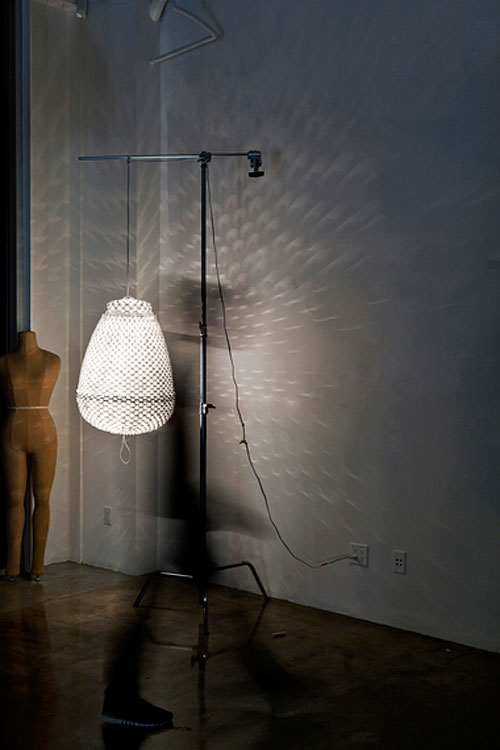 Den är gjord i tyvek, ett tunt och oerhört tåligt plastmaterial, och ser mycket tyngre ut än vad den nog förmodligen är, det är intressant när material lurar ögat så tycker jag. Den ser också väldigt spännande ut när den lyser. Lampan fick jag tips av via Lotta Agaton.