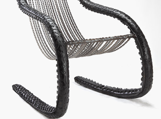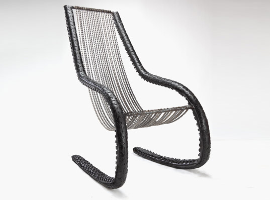 Det är precis vad det ser ut att vara – en gungstol i cykeldäck och kedjor. Jojomän. Från företaget BRC Design där entreprenören Benjamin Rollins Caldwell verkar vara den som bestämmer. Cool snubbe, cool produkt.