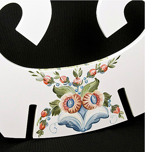 Bocken är vitlaserad och tillverkad i Dalarna, där ju också Slottsbarbro målar dem. Bo mäter 60 x 60 x 28 cm när han är ihopsatt. För utbud och mer information, se här.