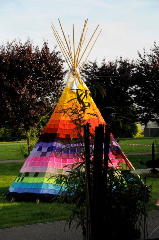 Det skulle kunna vara så att den finns i tyska Solingen, men så mycket mer än så kan jag inte riktigt läsa ut. Annat än att det ju är ett gigantiskt stickat tält förstås. Kolla också in mer bilder här.