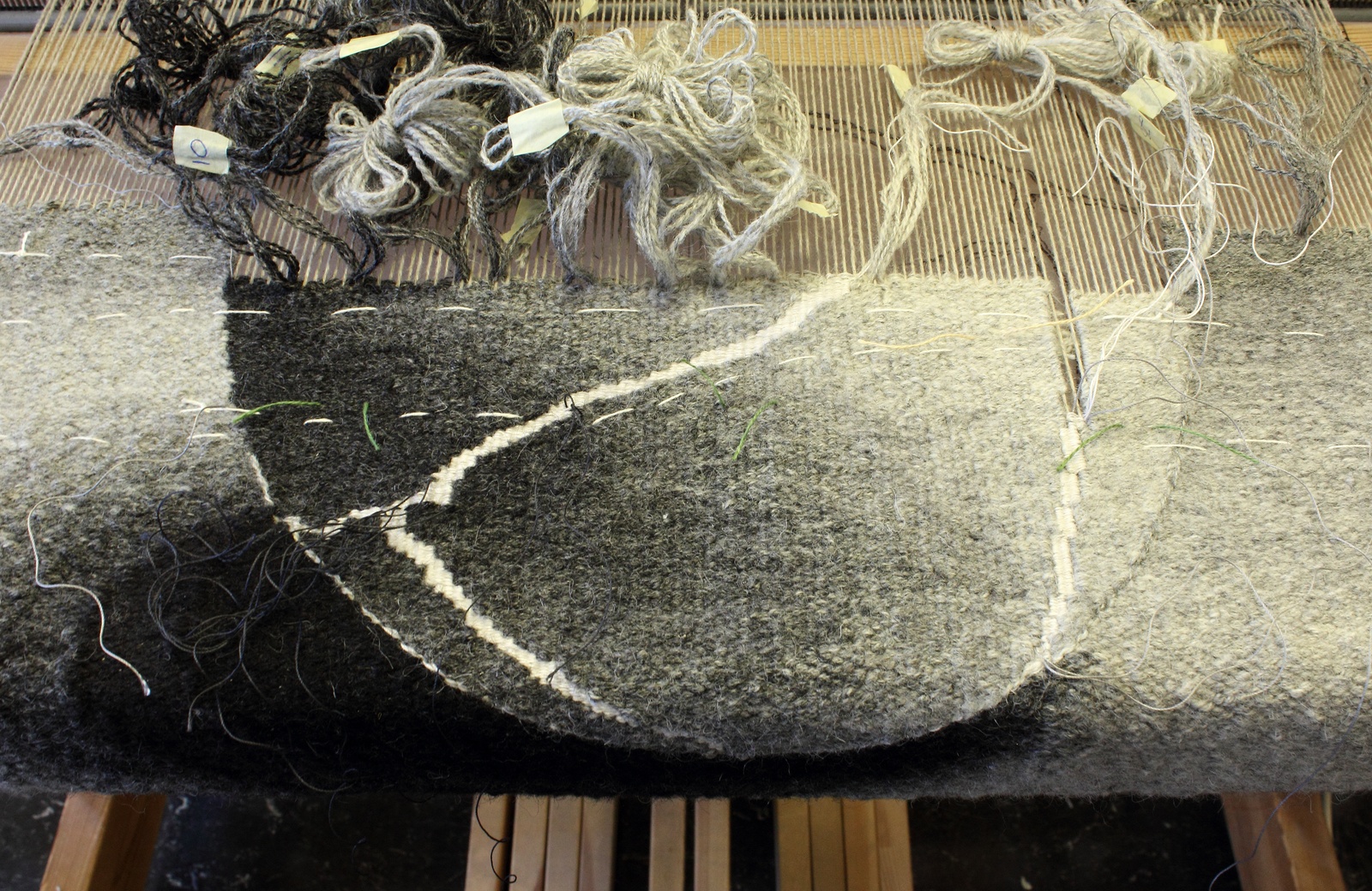 Flygande matta av Maki Imaeda Fokine, gjort i rosengång: ”Jag ville skapa en möbel i form av en ”flygande matta” genom att kombinera vävd matta med glasfiberväv. Grundidén är att skapa någonting med känsla av lekfullhet men samtidigt funktionellt. Mattan är vävd i rosengång och tanken med mattans geometriska former är att på optisk väg skapa ett vågigt intryck”. (Foto Erik Thor)Installation/kollektion med titel I rörelse av Klara Broström: ”Materialet är kärnan. Jag låter det styra mig till att hitta nya uttryck. För mig handlar textil om yta och struktur, om den taktila och visuella känslan. Jag inspireras av att jobba experimentellt, att låta arbetet och uttrycket formas längs vägen. Att skapa ett material från första tråden eller att se möjligheterna i det redan använda. Att bearbeta, manipulera, ta isär och bygga upp. Förvandla, förvalta, förädla. I form av kläder får mina material ett nytt sammanhang, nytt liv.” (Foto Erik Thor)