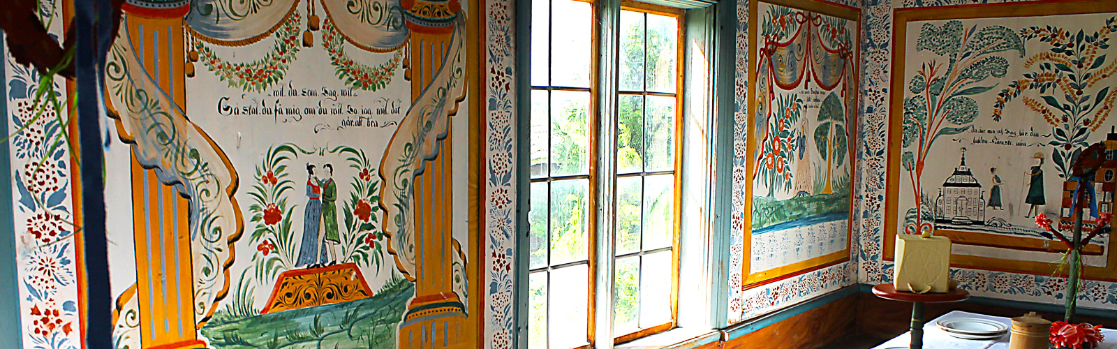 Jag har ju dels varit runt i krokarna, sommarhälsinge som jag är, dels nu ägnat lite tid åt att läsa på och uppdatera mig, och slås gång på gång av hur vansinnigt vackert och välordnat det är i och runtomkring dessa hälsingegårdar. Mönsterprakten är så ofantlig, den otroligt spännande matchningen av färger, schabloner, material och inte minst målningar gör att vilken samtida inredningstidning som helst bleknar i jämförelse.
