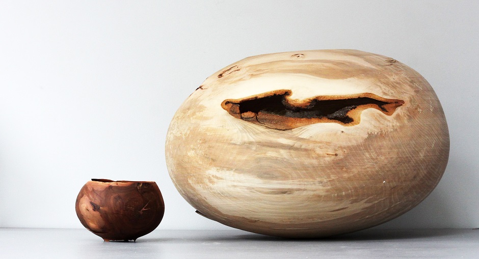 Christoph Finkel arbetar i det trä han har runt knuten, mycket äppelträ, ek, björk, bergsal – han bor i tyska Alperna och hämtar sitt material precis från sitt hus, vilket gör att han tar det han hittar och förvandlar det utifrån trädens egna förutsättningar och former. Det gör att det blir skavanker, håligheter ibland, skiftningar i träet som liksom följer med i formen. Alla skålar och objekt är ihåliga, han svarvar och använder handverktyg, ibland får verken ytbehandling, men ofta är de helt obehandlade och förändras därför över tid.