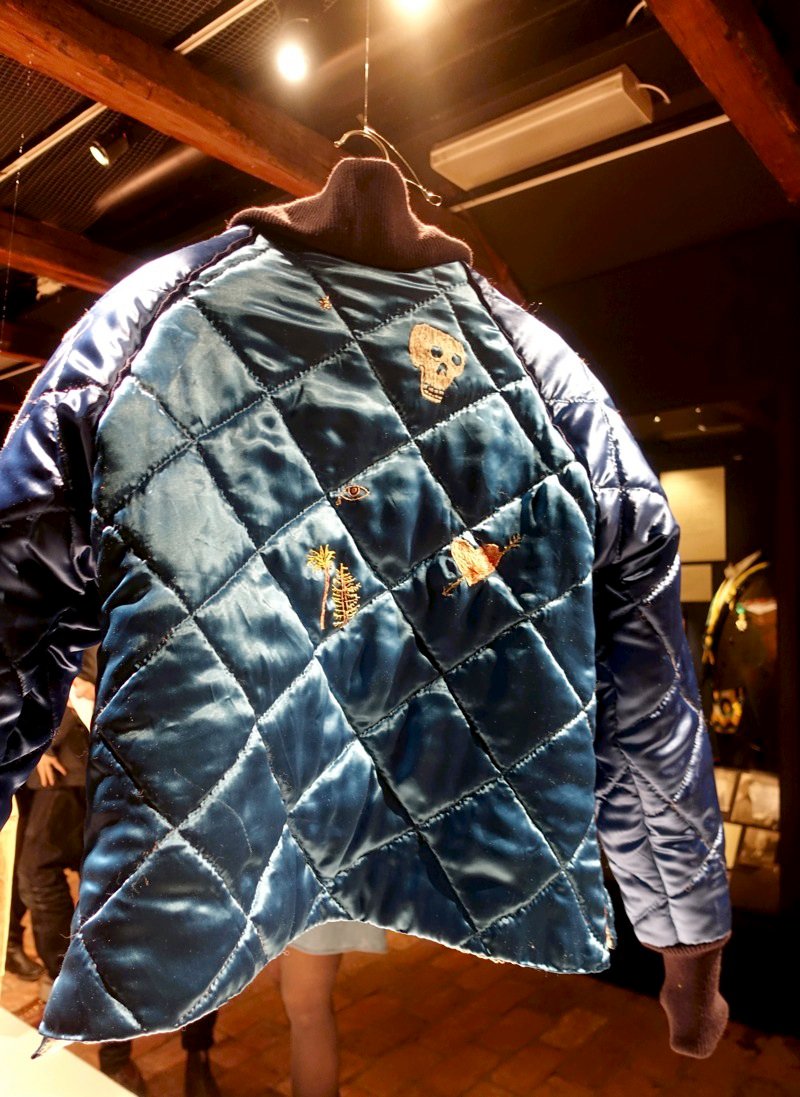 Här ser vi bland annat liv och kjol av utslitna kläder, mestadels strumpor – som hon fäst samman med små silkestrådstygn. Dräktbyxor av en nedmonterad mockajacka med inspiration från en mc-byxa, och inte minst den fantastiska Sverjejackan; vändbar handsydd quiltad jacka stoppad med bomullsvadd, med fantastiska broderier av djur. Ida har hämtat inspiration från japanska Sukajan, souvernirjackor.