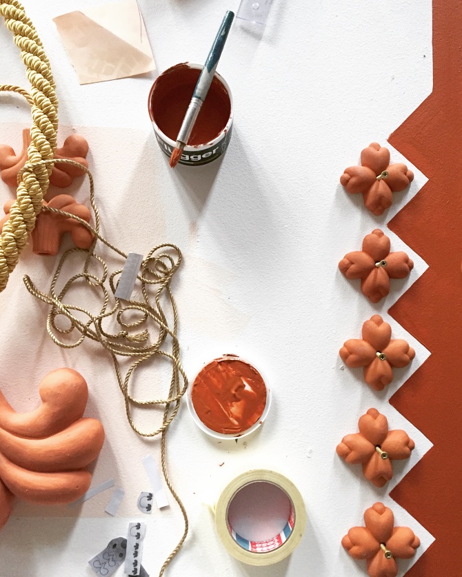 På Kaleido visar hon arbeten i brun lergodslera – som hon effektivt blandar med guld, masonit, rep, tapet och dekorplast – hennes kollage växer ut över väggarna föreställer jag mig. Inte minst för att hon så effektfullt använder sig av schablonmålade mönster direkt på väggarna i utställningen.