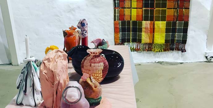Åsa Jungnelius snippskålar i förgrunden, och No blue without orange av Josefin Gäfvert ståtligt upphängd på väggen i utställningen Tête-a-tête. (Foto Olseröds konsthall)