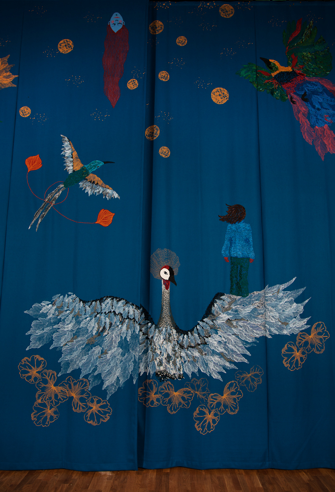 Ridån är gjord i olika tekniker, screentryckta teckningar, broderi och adderade tygapplikationer. Allt format till en helhet av konstnären Carina Marklund. (Foto Edvard Koinberg/Folkets Hus&Parker)