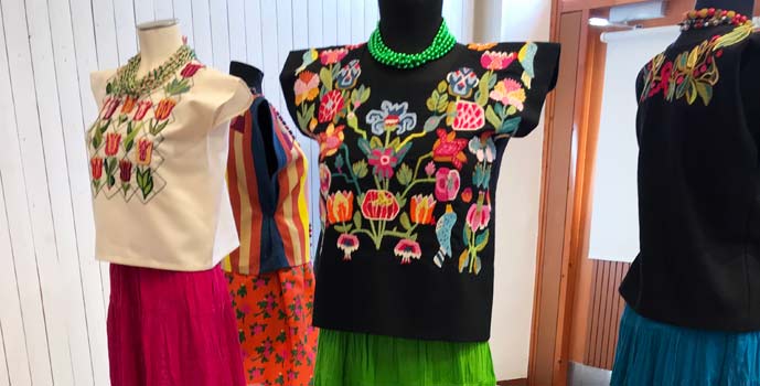 Eva Davidsson har arbetat med de likheter som finns mellan uttrycken i de skånska flamskvävnader och yllebroderier som hon hittat i arkiven i Skåne, och de broderade blusarna från Mexiko.