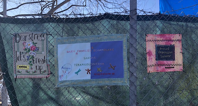 Första taggningen var på temat Metoo, andra på klimatkrisen och nu i år var temat psykisk ohälsa. Ämnet behandlas olika utifrån olika avsändare och tekniker, men eftersom handarbete tar tid är det ofta tydliga och eftertänksamma budskap som möter betraktaren av detta uttryckssätt. Om man nu ska lägga tid på att säga något behöver man liksom ha tänkt igenom vad man vill säga.
